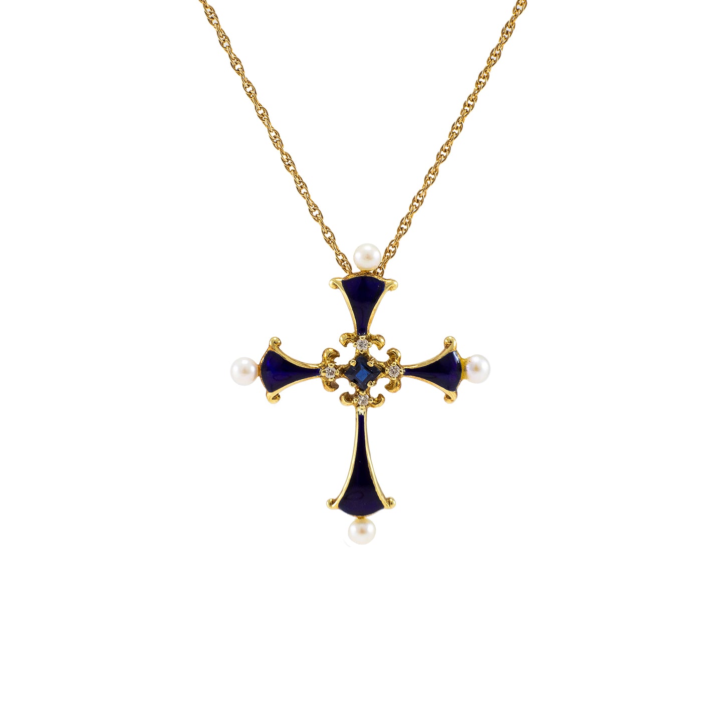 Art Deco necklace pendant cross diamond pearl enamel sapphire yellow gold 585 women's jewelry