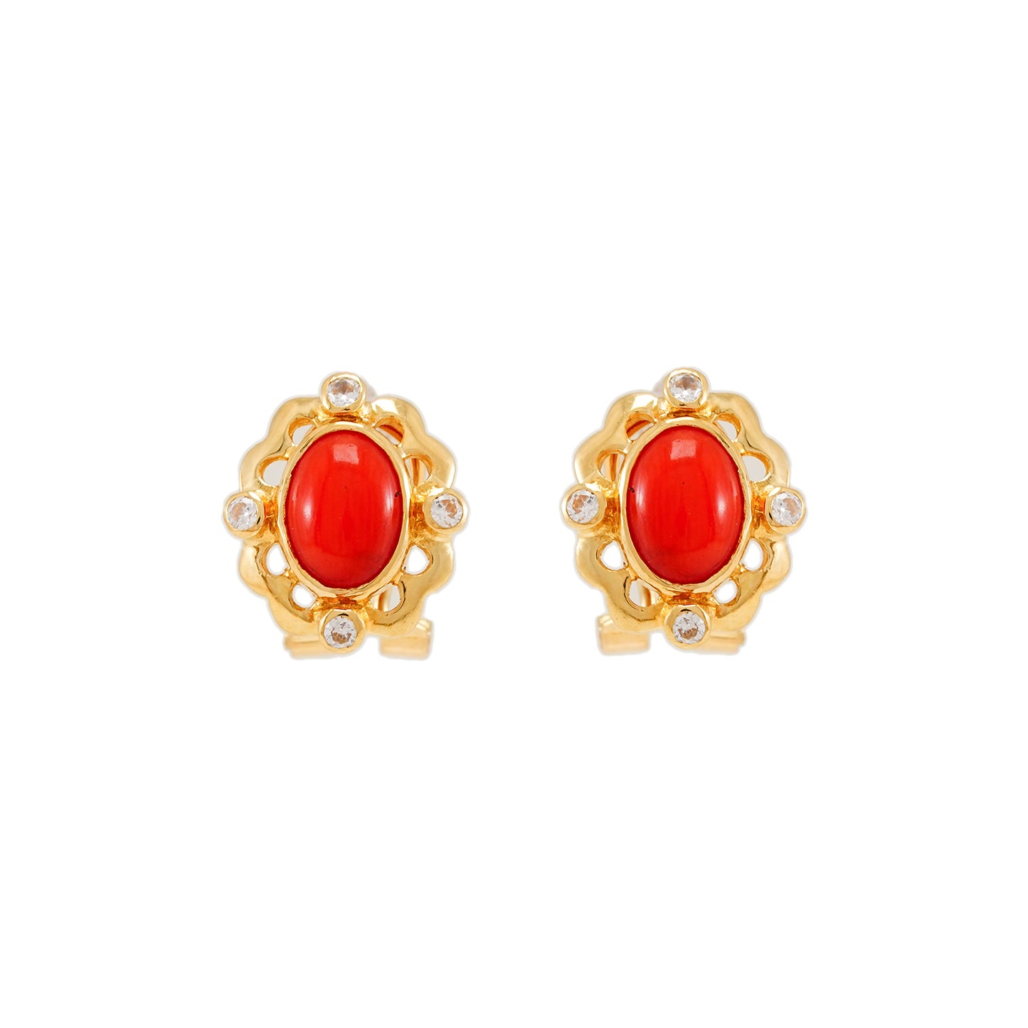 Gemstone Earrings Coral Zirconia Yellow Gold 18K Women's Jewelry Vintage Plug