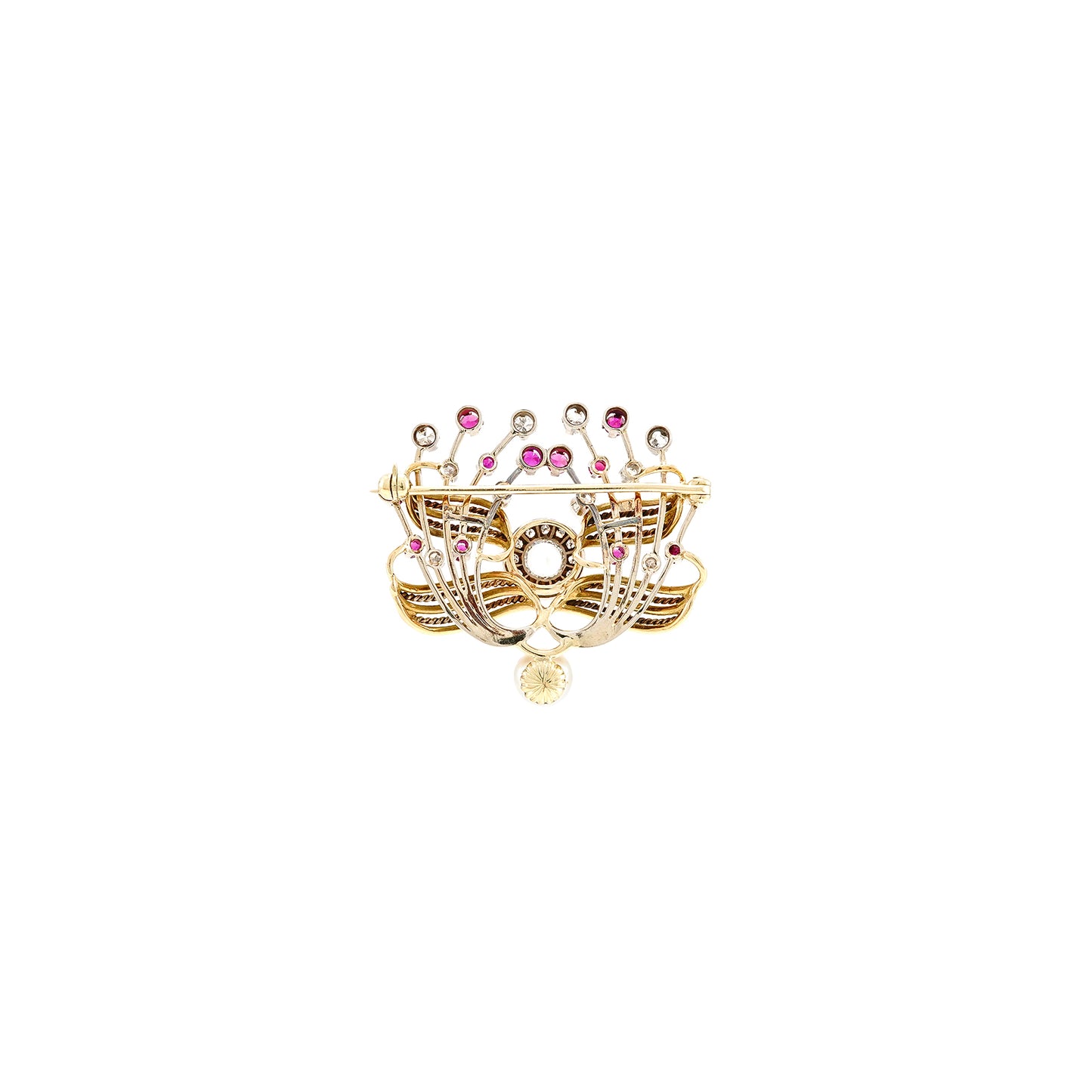 Art Deco Diamantbrosche Altschliffe Perle Rubin Gelbgold 18K 14K Antikschmuck